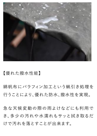優れた撥水性能】綿帆布にパラフィン加工という蝋引き処理を行うことにより、優れた防水、撥水性を実現。急な天候変動の際の雨よけなどにも利用でき、多少の汚れや水濡れもサッと拭き取るだけで汚れを落とすことが出来ます。